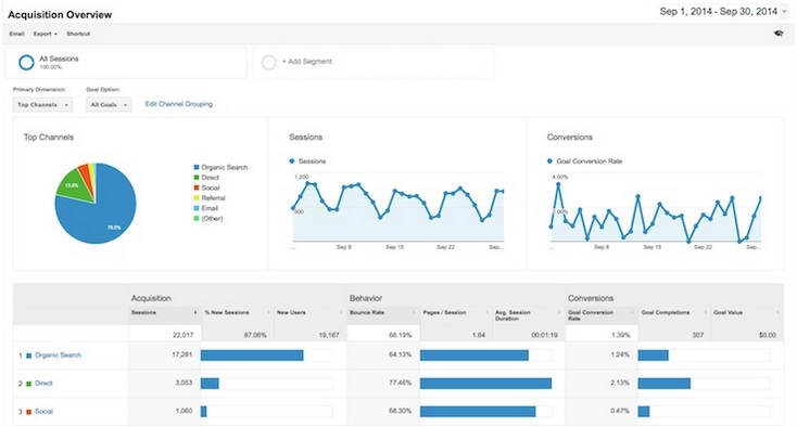Consumers will arrive at your site from a variety of channels. The acquisition function breaks down their route to entry – including search engines, direct traffic, and referrals such as social media, forums etc. – to see where traffic is coming from.